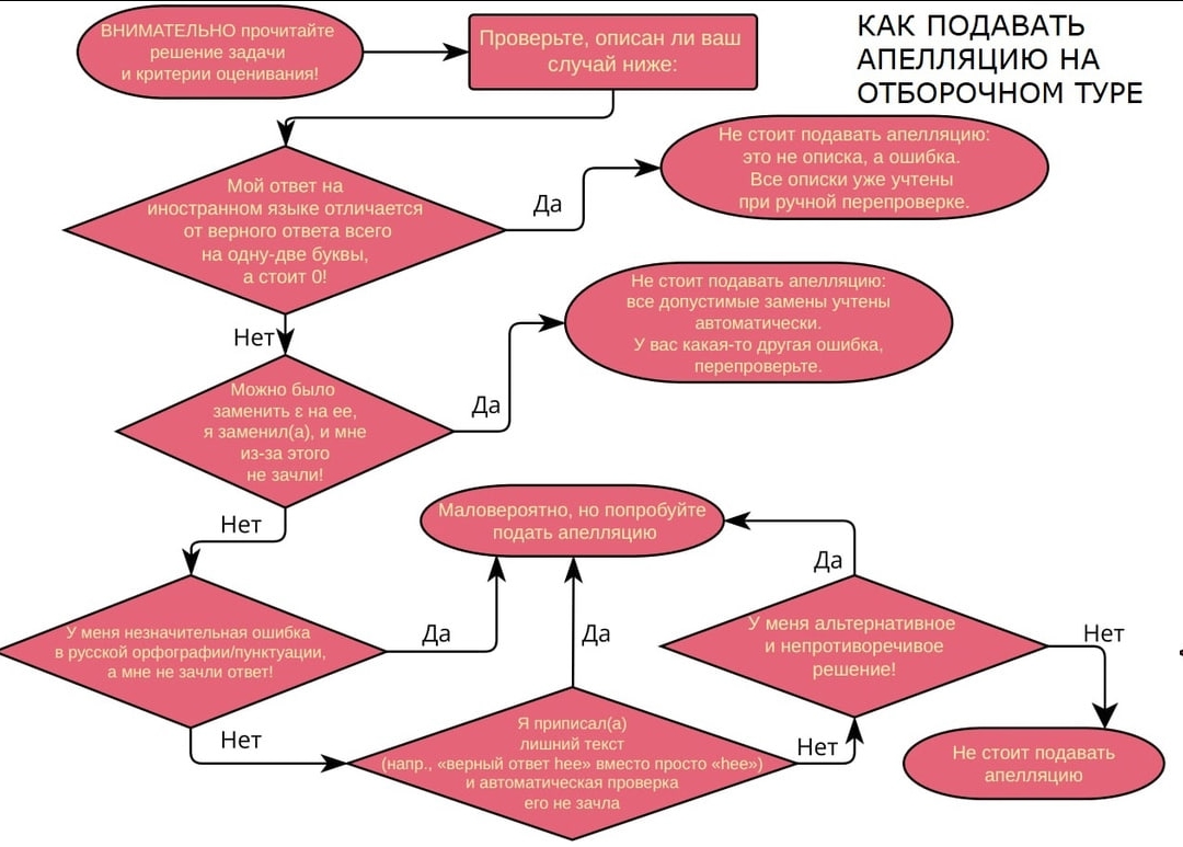 Мы настоятельно просим вас не подавать апелляцию до ознакомления с критериями (можно найти в файле в конце этой новости, пароль lingvistika) – пожалуйста, внимательно ознакомьтесь с ними и с оцениванием своей работы, убедитесь, что в вашем личном кабинете нет технических ошибок, а также – прочитайте (или вспомните) алгоритм апеллирования, который поможет вам понять, насколько успешной и осмысленной будет ваша апелляция.